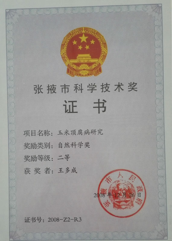 2008年榮獲張掖市科學(xué)技術(shù)二等獎證書(shū)
