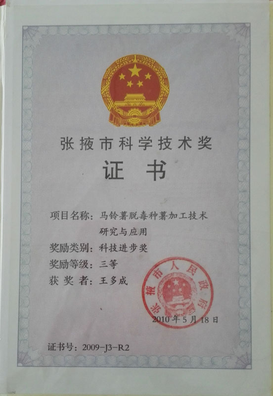2010年榮獲張掖市科技進(jìn)步三等獎證書(shū)