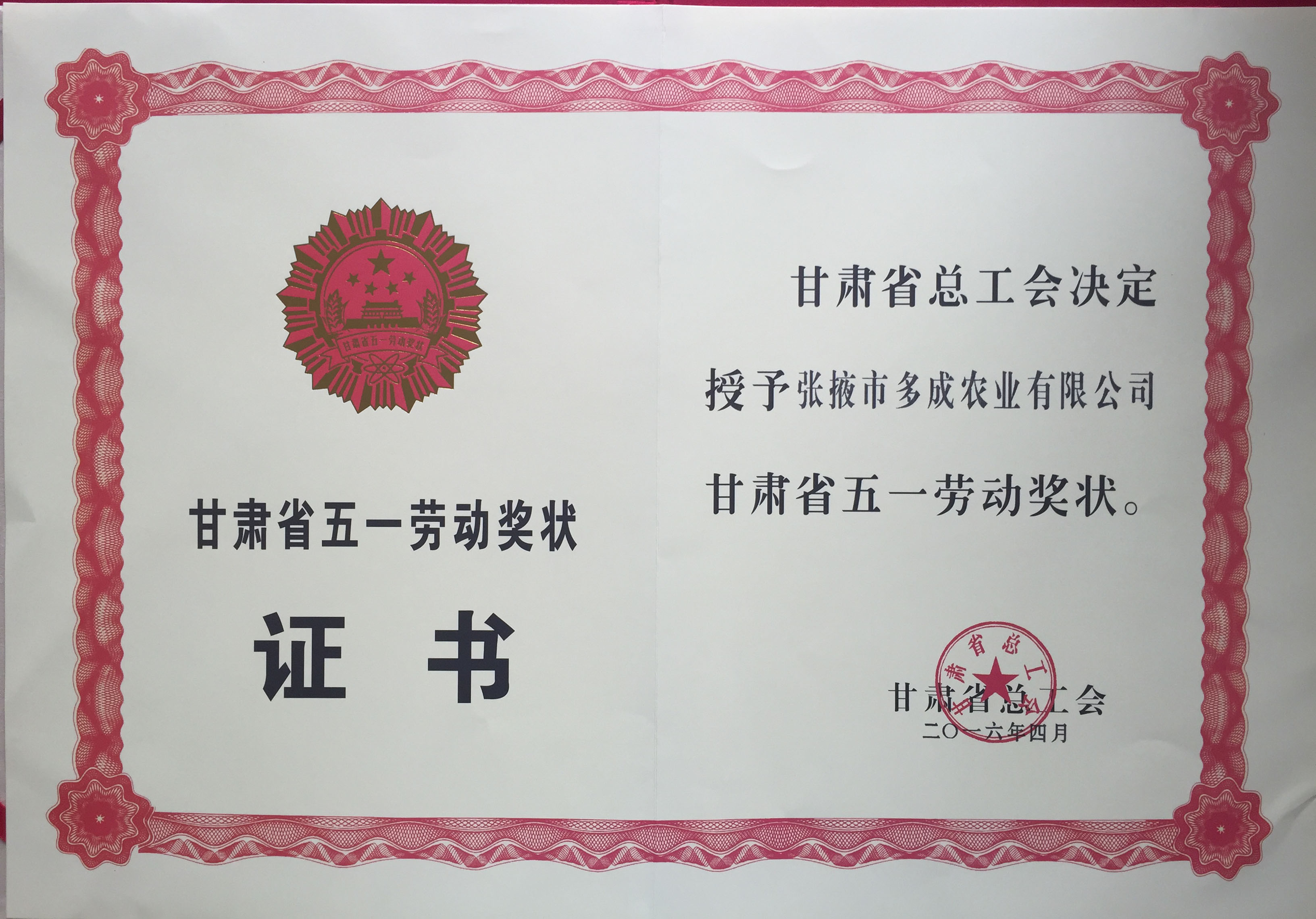 張掖市多成農業(yè)有限公司經(jīng)張掖市工會(huì )推薦,榮獲2016年度甘肅省五一勞動(dòng)獎狀。