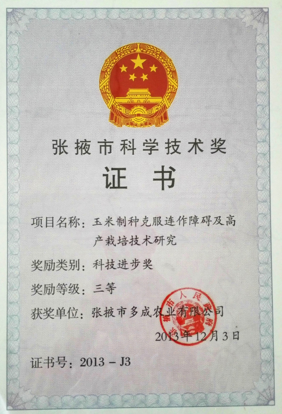 | 玉米制種克服連作障礙及高產(chǎn)栽培技術(shù)研究市科學(xué)技術(shù)獎三等獎 | ||